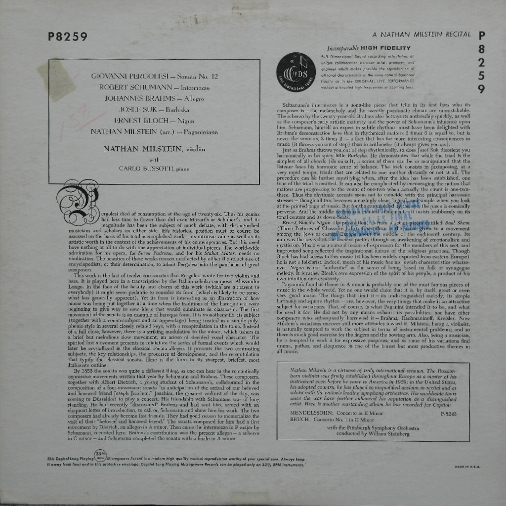 Milstein Recital (Pergolesi, Schumann, Brahms, Suk, Bloch, Paganini)