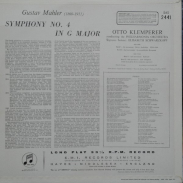 카테고리: Columbia, Klemperer, Schwarzkopf, Symphony / Orchestral music (교향곡 / 관현악곡), U.K. (영국).* Serial No (상품번호) : COL 1704