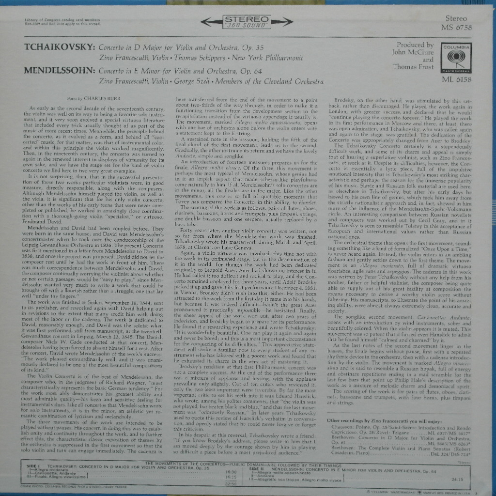 * Performer (연주가) : Z. Francescatti, T. Schippers, N.Y. Phil., G. Szell, Cleveland Orch.