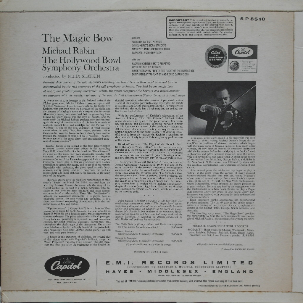 * Performer (연주가) : M. Rabin, F. Slatkin, Hollywood Bowl Sym.