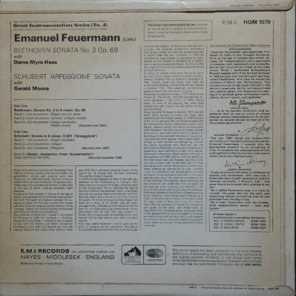 * Performer (연주가) : Emanuel Feuermann, Gerald Moore, Myra Hess