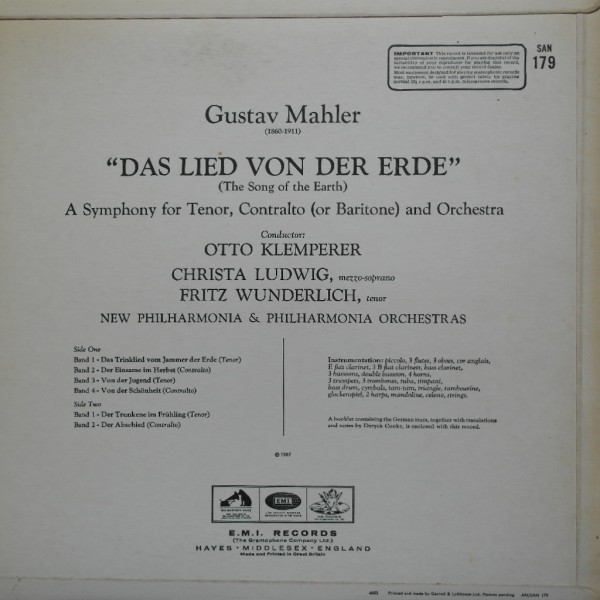 * Performer (연주가) : C. Ludwig, F. Wunderlich, O. Klemperer, New Philharmonia Orch.